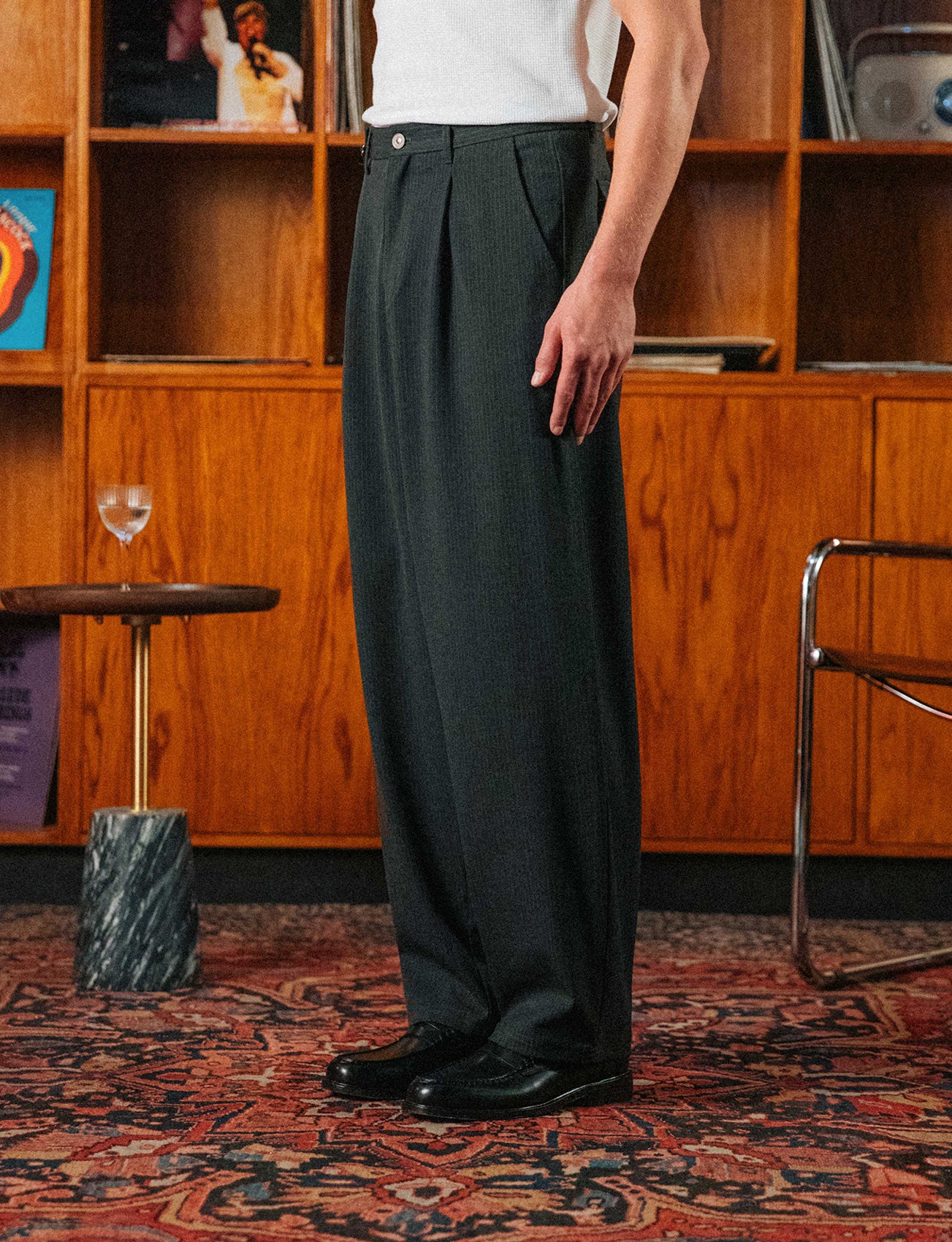 Crafted in a true barrel-leg shape with gentle grey pinstripes, these trousers merge classic gents’ tailoring with a modern perspective. Finished with a utility-inspired side clasp and silver hardware.