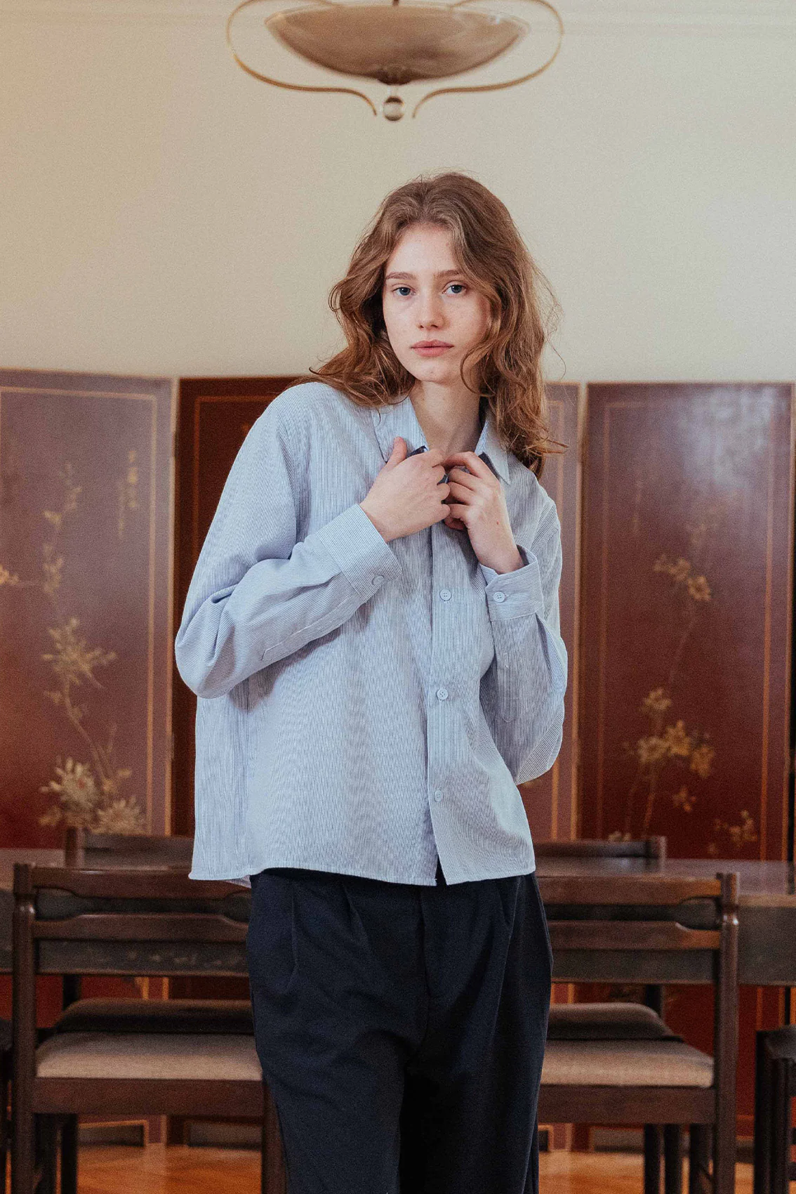 Inspired by the rustic pinstripes utilised in vintage workwear styles. Cut from lightweight cotton with a boxy silhouette, finished with a classic locker loop detail at the reverse.