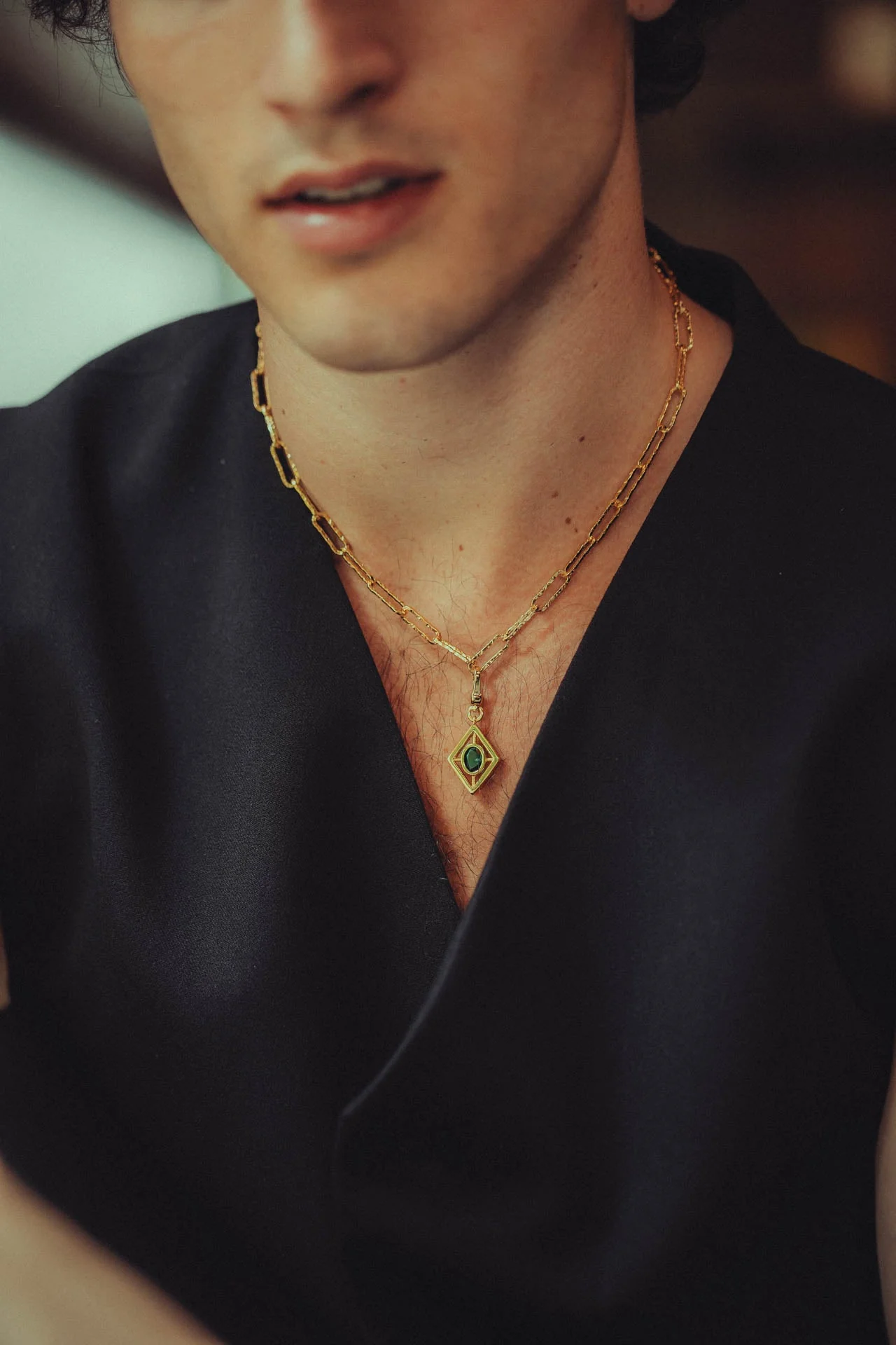 This lariat necklace features intricate link chains and a captivating gold pendant adorned with our signature Cubic Zirconia emerald gemstones.